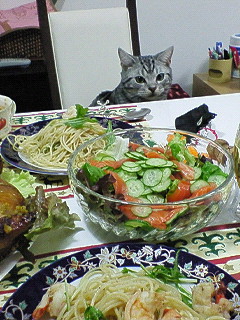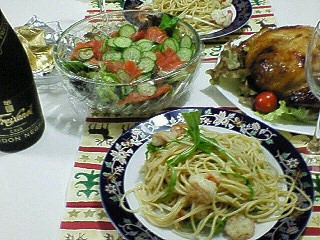 海老とアンチョビと水菜のパスタ。テレビで紹介していたのを真似てみました。具だくさんミネストローネ。レトルトですが美味しい!