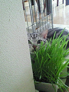 写真は、猫草葉の陰から獲物を狙う肉食動物。