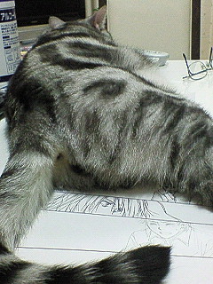 ごはんが欲しいらしく、さっきまで私の頬にオデコをくっつけたまましばらくおねだりポーズを取っていました。原稿は踏まれ放題。