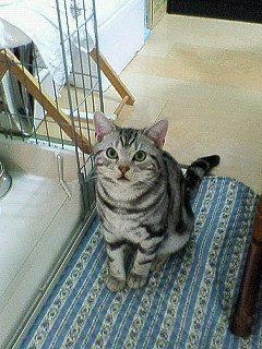 普段ご飯を食べているケージの中をチラチラ見ながら、こちらをガン見して「猫缶パッカンまだ!?」と訴えています。