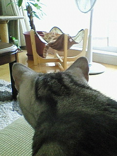 ニャンモックの存在を認識したニャンコの存在を認識したニャンコ。