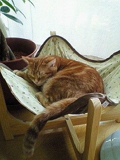 半日ほど完全に無視され続けていたニャンモックですが、日曜の昼間、ようやくチィがその存在を再認識したらしく、昼寝ベッドとして使って下さいましたvv