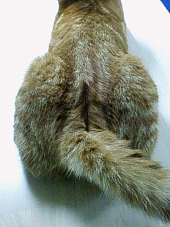 根元からシッポの先にむかって、真ん中に毛の分け目ができてます。神経的な何かが緊張してるのかしら。