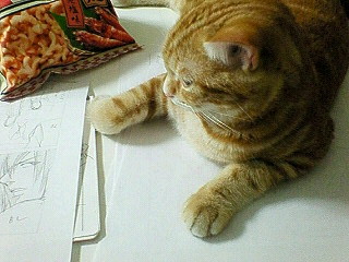 テーブルも用紙も白くてわかりにくいのですが、完全に下描き用紙の上で寝とります。