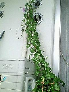 写真は、今年の入谷朝顔市で買った朝顔。むちゃくちゃ伸びてます。花もかなり咲いてます(昼ごろ撮影したのでしぼんじゃってますが)。
